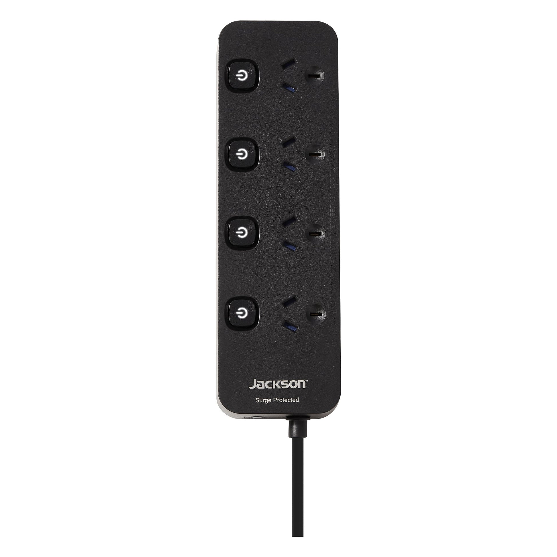 The Jackson surge-protected powerboard features four individually switched outlets. Built-in overload protection and illuminated switches provide added safety and convenience for home or office use.